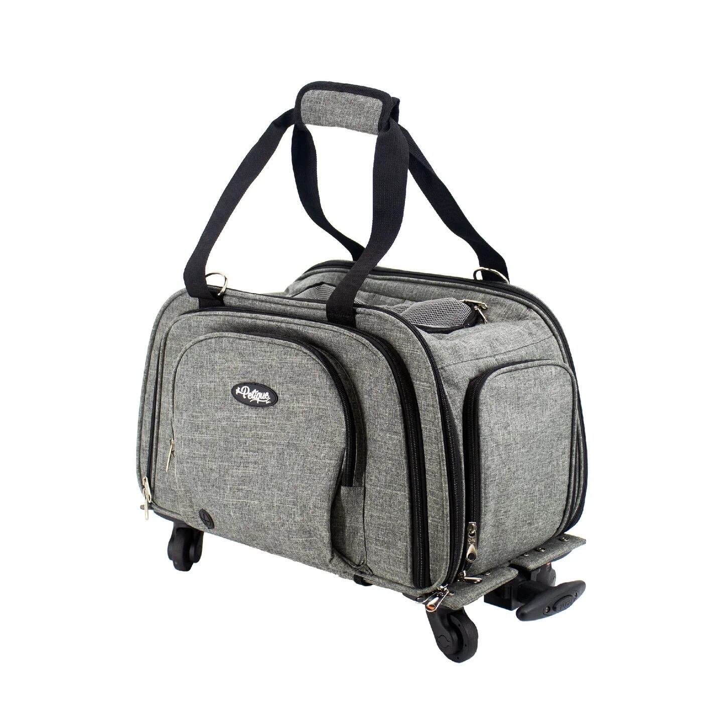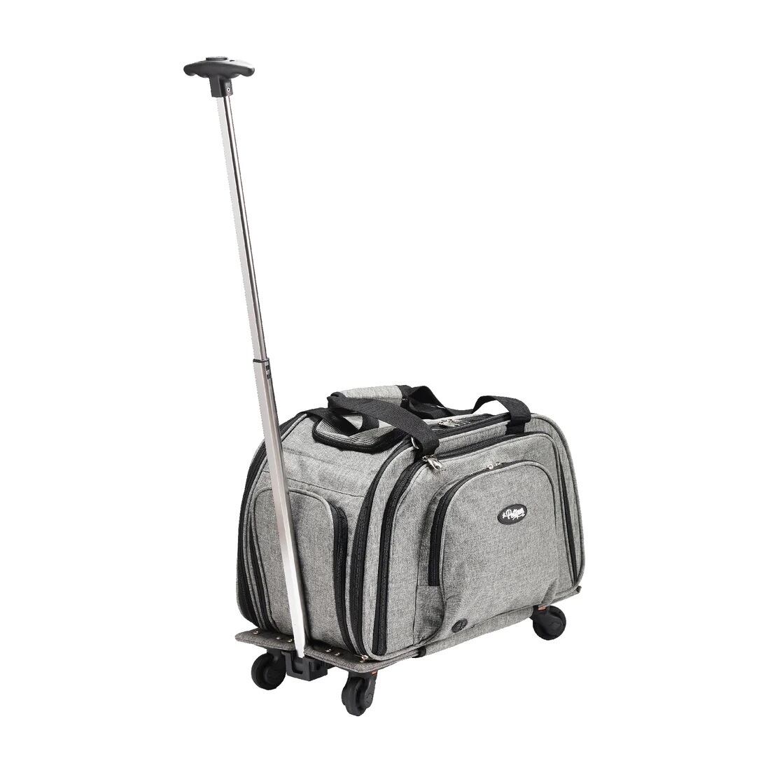 PetiqueのHappyCamper(ハッピーキャンパー)ペットキャリーは、360度スムーズに移動できる車輪付きで、4方向に拡張可能な通気性の良いハウスにも変わるユニークなデザインです。